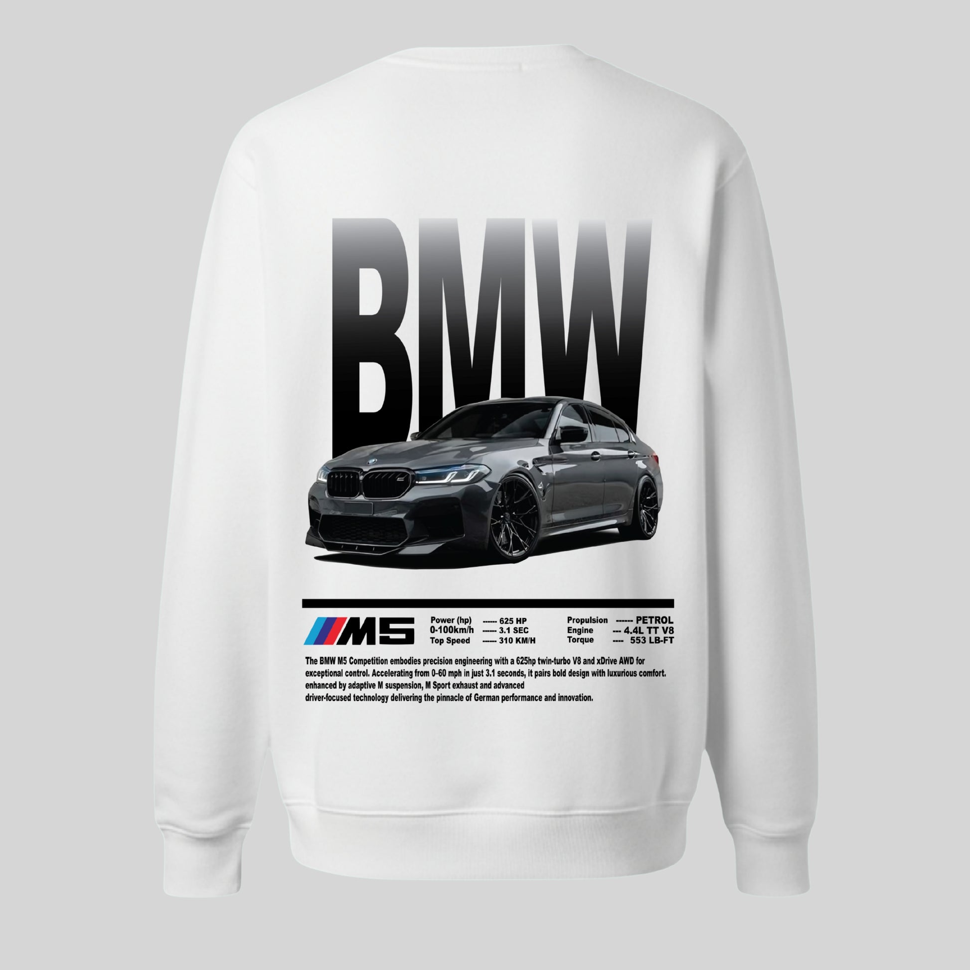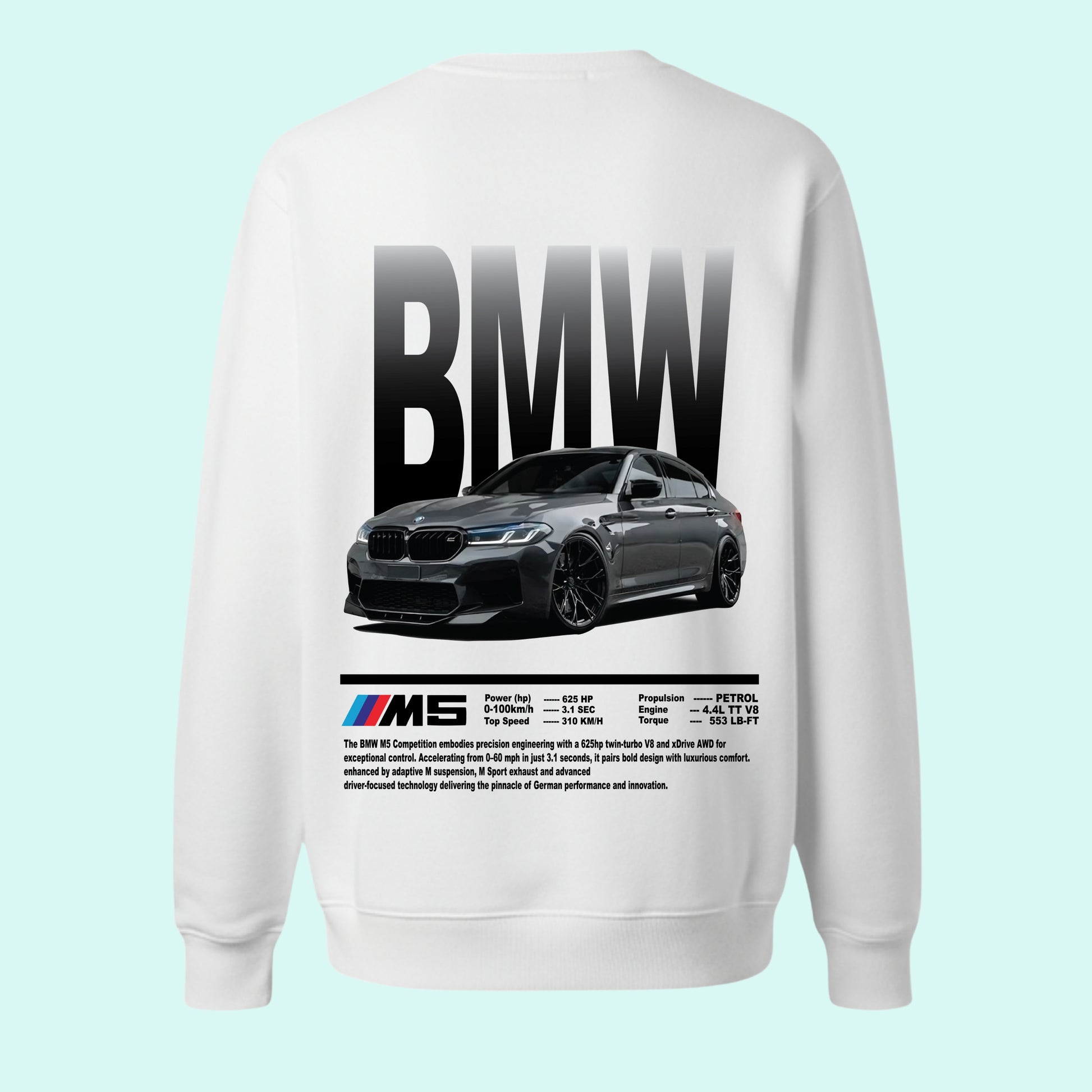 Rev up your style with the energy of the streets and the soul of a performance beast. The BMW M5 Enthusiast Graphic sweatshirt isn’t just clothing, it’s a statement. Featuring a bold and aggressive sports car design on the back, this premium pullover is made for those who live life in the fast lane. Crafted from a soft and breathable cotton blend, it delivers unbeatable comfort for both men and women. Available in multiple sizes for the perfect fit. Whether you're hitting a car meet, cruising through the city or just showing off your passion for speed and power, this sweatshirt lets the world know what drives you. It’s more than fashion, it’s horsepower you can wear. This sweatshirt lets you wear your passion with pride.