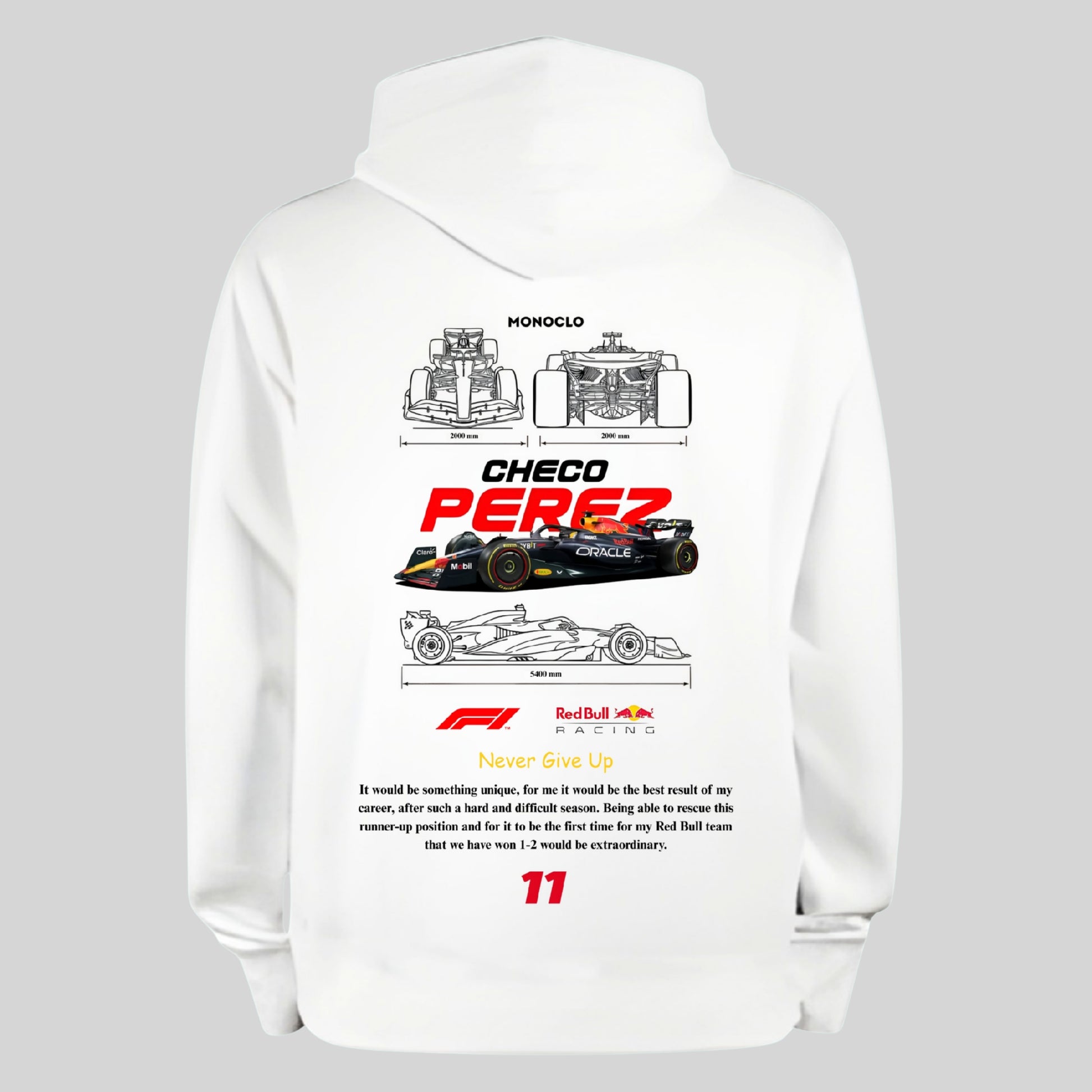 Premium Red Bull Inspired Design: Features a high-detailed Checo Pérez racecar blueprint graphic and his motivational "Never Give Up" quote on the back.